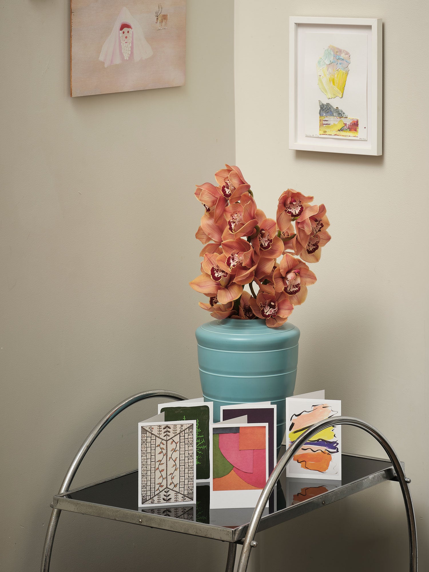 What I like most about the act of sending a card is the making of the card. The cards I make are typically collages of whatever materials are on hand or scraps from the studio floor—coloured duct tape, aluminium offcuts, synthetic gemstones, bits of paper streaked with spray paint. These rough assemblages are definitely not archival or conservation grade.